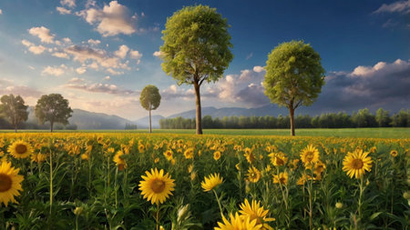 A vast sunflower field in full bloom with a stunning sunset and mountains in the distance, epitomizing serene natural beauty and the calmness of an idyllic rural landscape. AI generated image