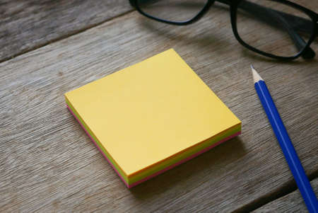 Pencil,glasses and empty yellow sticky notes on wooden background.Copy space.