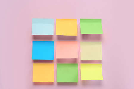 Sticky, notes stack on pink background looks bright. Colorful paper pads suit office or creative tasks. Ideal for planning or design themes.