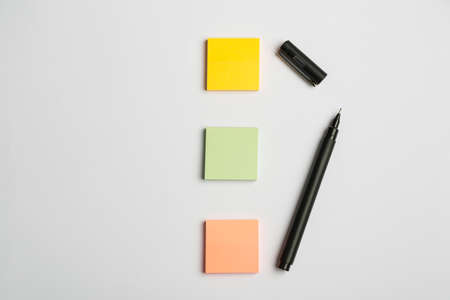Close-up of color sticky stickers on a gray background. yellow, pink and green paper cards mock up with copy space.