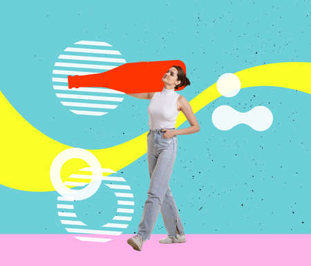 Contemporary art collage. Inspiration, idea, trendy urban magazine style. Young girl carries huge drawn wine bottle on her shoulders isolated on abstract background.