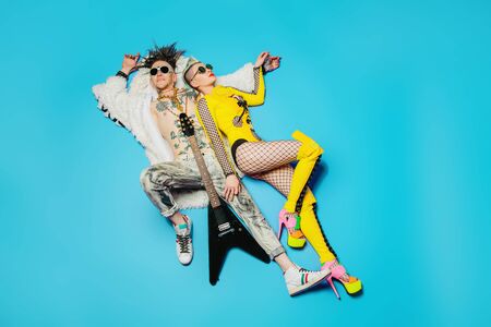 A portrait of two cool young punk people posing in the studio. Casual punk fashion, rock band.