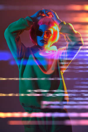 Funny girl in glasses with glitch effect on her face. Toned image