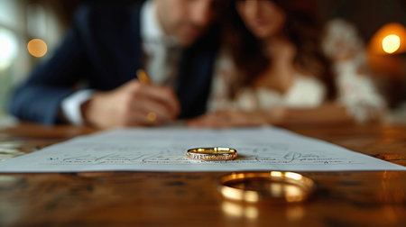 Wedding rings and signing ceremony with elegant background. Concept love, commitment and love.