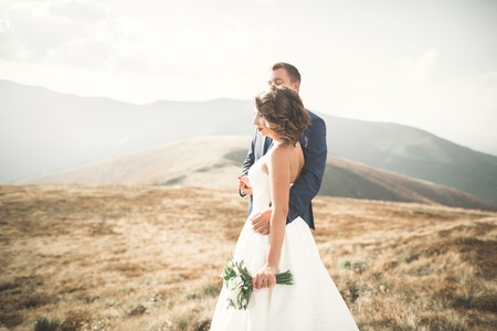 Happy wedding couple posing over beautiful landscape in the mountains