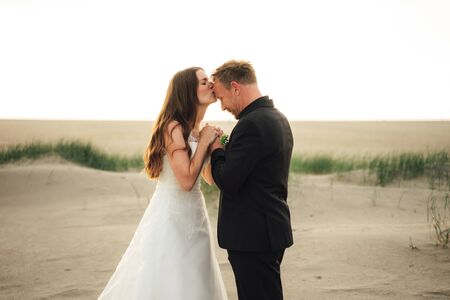 Happy and romantic scene of just married young wedding couple posing on beautiful beach