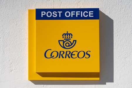 Santiago de Compostela, Spain. february 22, 2020: Correos sign on white wall. Correos is the Spanish postal service