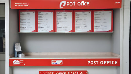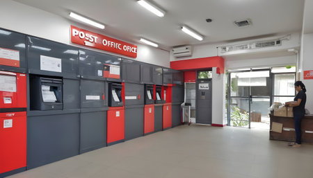 Red numbered 01 to 76 post office boxes at a mail centre in New Zealand.