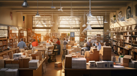 A focused, full body shot of a postal worker (mid-30s, male) sorting colossal stacks of Valentine's