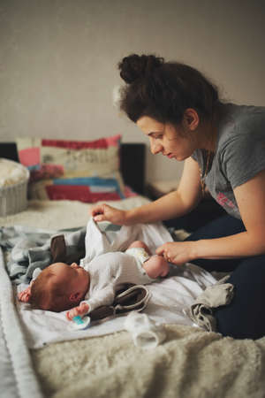 young mother change baby clothes