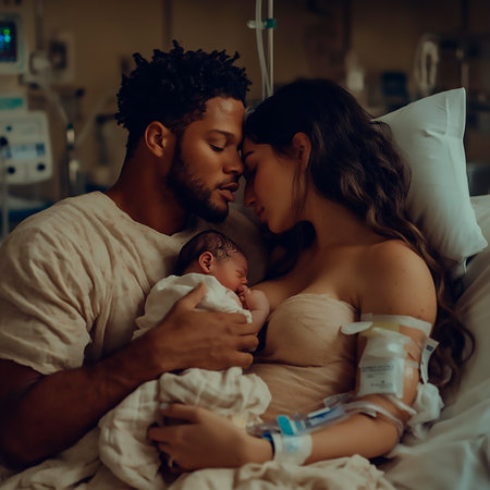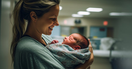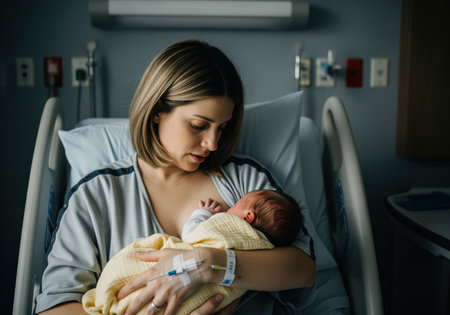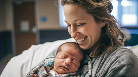 A heartwarming scene capturing a mother holding her newborn baby close in a hospital room. The soft lighting and emotional connection highlight the nurturing bond and joy of new beginnings.