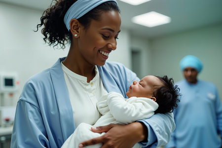 A joyful mother, wearing a blue headband and gown, cradles her newborn baby in a hospital setting, with medical staff in the background.