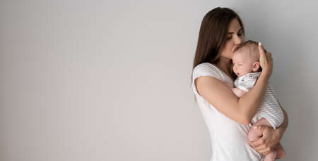 Beautiful young mother holds a small infant. Kissing the kids. White wall copy space. Panorama and banner. Place for text.