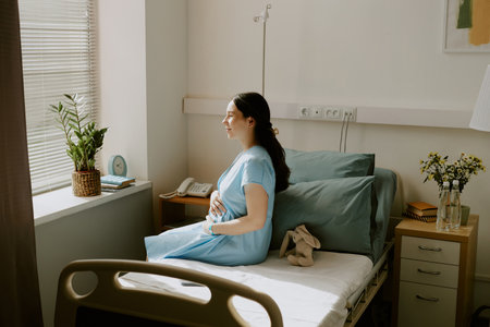 Young pregnant woman sunbathing in hospital ward and enjoying moment
