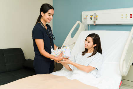 Beautiful happy nurse bringing the newborn baby to an excited new mother resting in the hospital bed
