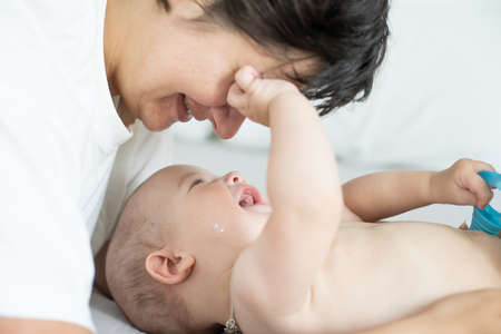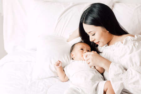 New asian mom playing to adorable newborn baby on bed smiling and happiness at home.Mom talking with infant baby and holding her hands laughing together.Baby and Mother day concept