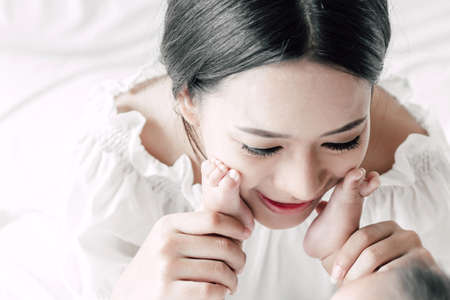 Close up portrait of beautiful young asian mother with newborn baby. Side view of a young woman playing with her little baby.