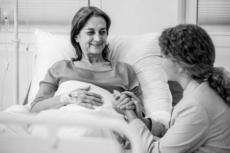 Smiling elderly woman and caring daughter holding her hand in the hospital, black and white photo