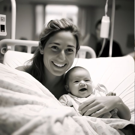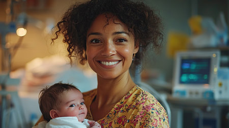 A joyful mother holds her newborn baby close in a hospital setting, showcasing a tender smile that reflects love and connection in their first moments together.