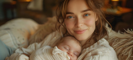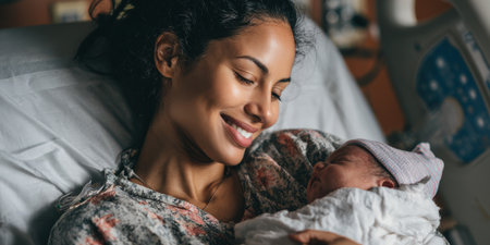 Young mother smiling softly while tenderly holding her sleeping newborn in a hospital bed, celebrating quiet, intimate first moments of bonding, love and new life after birth