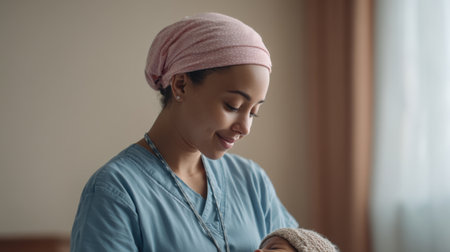 A caring nurse cradles a newborn with tenderness in a softly lit environment. This image beautifully captures the warmth and connection in healthcare settings.