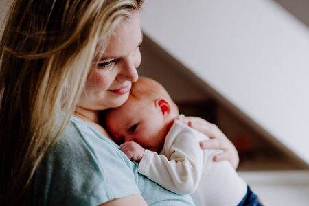 Young mother, holding tenderly her newborn baby boy, close portrait