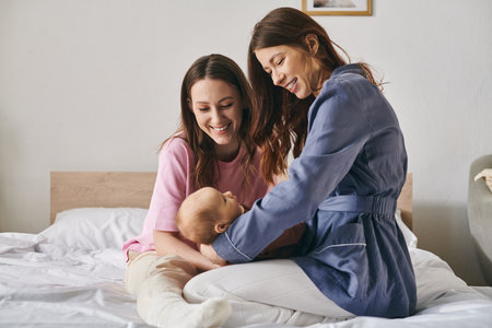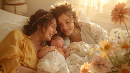 LGBTQ+ parents lovingly caring for their newborn in a cozy nursery, warm sunlight streaming through the window