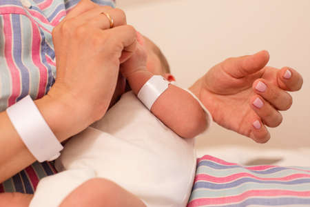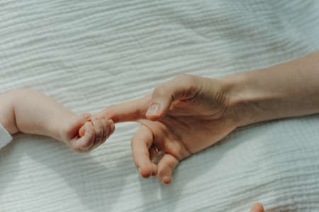 Newborn children's hand in mother hand. Mom and her Child.