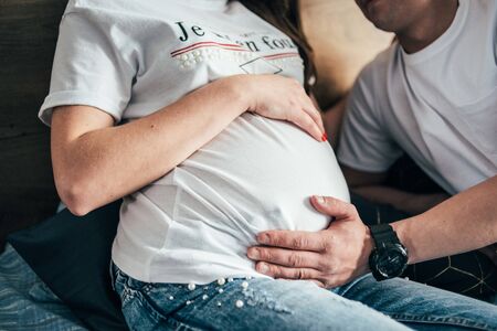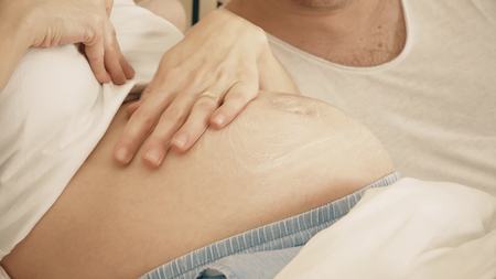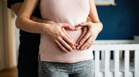 Close up of a man and pregnant woman holding her baby bump together. Their hands form a heart shape, symbolizing love and anticipation for their new baby.