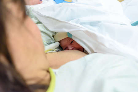 Newborn baby in hospital ward in his mother's arms