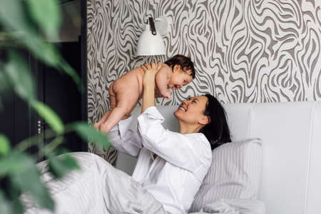 Mother and child on a white bed. Mom and baby boy in diaper playing in bedroom. Parent and little kid relaxing at home. Family having fun together.