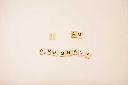 The inscription I am pregnant made of wooden blocks on a light pink background.