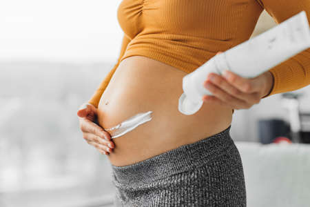 Pregnancy skincare. Pregnant woman applying cream on stomach for stretch marks. Moisturizing belly closeup of hands and lotion bottle at home
