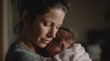 A mother cradles her newborn close to her in a softly lit room, enjoying a quiet moment together early in the day. Their bond reflects warmth and tenderness.