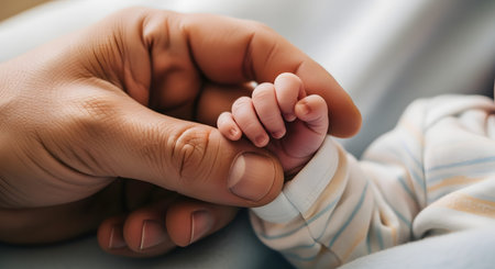 A tender close-up shot of a newborn baby's tiny hand, wearing a striped onesie, tightly gripping an adult's thumb. The image highlights the contrast in size and the strong bond between a parent and child. This represents new life, family, love, and protection.