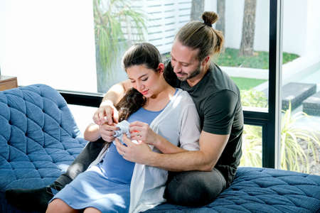 Pregnant Asian lesbian woman and her partner are happy to spend time together at home.