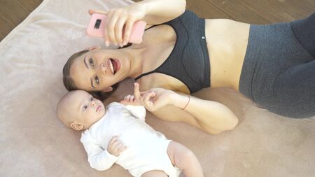 authentic shot of asian mother and her baby take selfie by mobile phone when lying on bed in close up