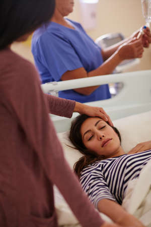 Get well soon.... Shot of a woman touching her friends forehead as she lays in her hospital bed.