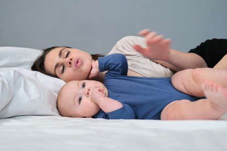 Portrait of beautiful young mother and her baby 7 month old son, parent and baby lying in bed together