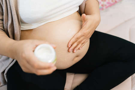 Unknown pregnant woman applying cream on her belly, close-up shot