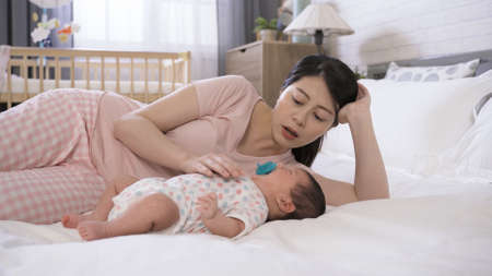 mom lying on her side and propping head on bed is trying to get her baby beside her to nap by patting and offering comforting words in the bedroom.