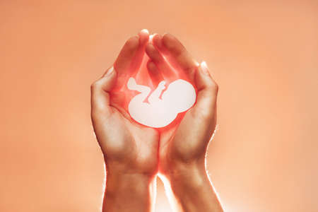 White paper embryo rest in hands of African-American or Asian woman. Soft focus. Orange background with the light from below. Pregnancy, contraceptive and abortion.