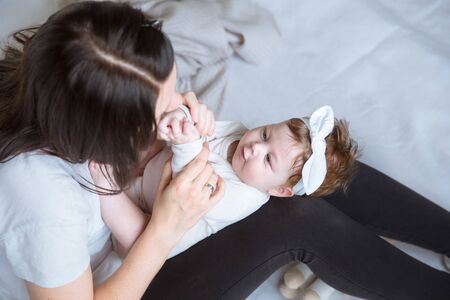 Caucasian loving mom play with cute baby boy child on bed in bedroom. Happy family, attractive beautiful caring young mother ticklish on toddler son enjoying activity relationship in morning in house.