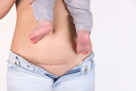 Close-up of a woman's belly with a cesarean section scar, five months after giving birth. Woman with a baby on her hand