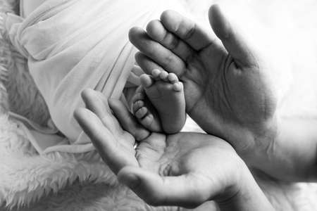 Feet of a newborn in the hands of a father, parent. Studio photography, black and white. Happy family concept.