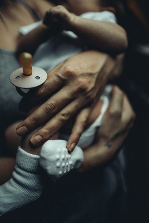 Mother holding newborn baby feet in hands