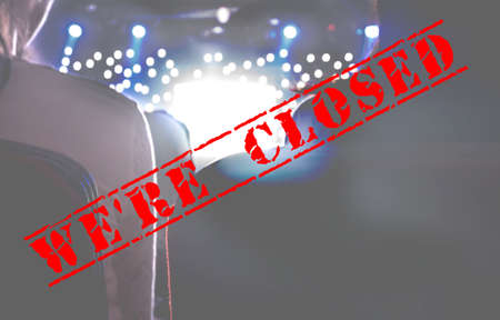 Cancelled entertainment show background. Concept of cancellation events due to to covid-19 outbreak. Text WE'RE CLOSED on blurred view of spectators back. People stay at home.