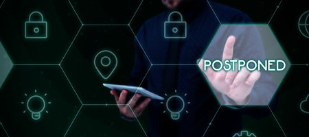 Text caption presenting Postponed. Business overview to place later in order of precedence, preference, or importance