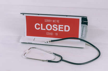 Concept on the topic of online business. The sign on the laptop with the inscription. Sorry We are closed COVID-19
