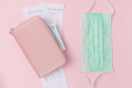 covid flat lay with piggy bank and consumer basket on pink background.